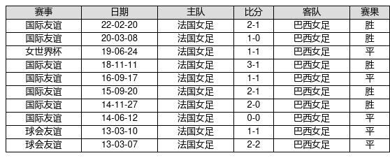 法国女足 VS 巴西女足两队近10年的交战次数为10场,法国女足5胜5平0负,赢球概率为50%,平局概率为50%,输球概率为0%。