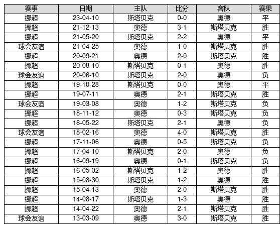奥德 VS 斯塔贝克两队近10年的交战次数为22场,奥德12胜3平7负,赢球概率为54.5%,平局概率为13.6%,输球概率为31.8%。
