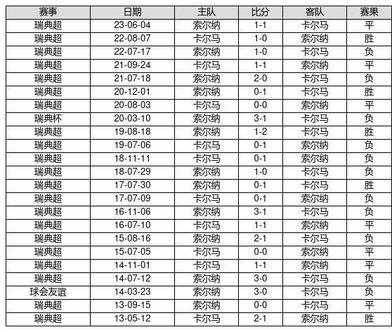 卡尔马 VS 索尔纳两队近10年的交战次数为23场,卡尔马5胜7平11负,赢球概率为21.7%,平局概率为30.4%,输球概率为47.8%。