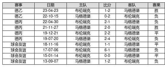 马格德堡 VS 布伦瑞克两队近10年的交战次数为10场,马格德堡2胜3平5负,赢球概率为20%,平局概率为30%,输球概率为50%。