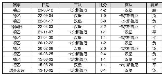 卡尔斯鲁厄 VS 汉堡两队近10年的交战次数为12场,卡尔斯鲁厄1胜5平6负,赢球概率为8.3%,平局概率为41.7%,输球概率为50%。