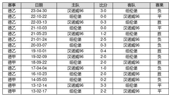 纽伦堡 VS 汉诺威96两队近10年的交战次数为15场,纽伦堡5胜4平6负,赢球概率为33.3%,平局概率为26.7%,输球概率为40%。