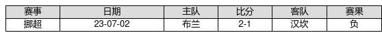 汉坎 VS 布兰两队近10年的交战次数为1场,汉坎0胜0平1负,赢球概率为0%,平局概率为0%,输球概率为100%。