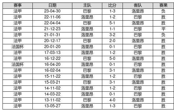 巴黎 VS 洛里昂两队近10年的交战次数为17场,巴黎14胜1平2负,赢球概率为82.4%,平局概率为5.9%,输球概率为11.8%。