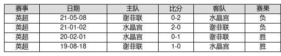 谢菲联 VS 水晶宫两队近10年的交战次数为4场,谢菲联2胜0平2负,赢球概率为50%,平局概率为0%,输球概率为50%。