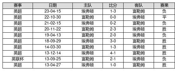 埃弗顿 VS 富勒姆两队近10年的交战次数为10场,埃弗顿5胜1平4负,赢球概率为50%,平局概率为10%,输球概率为40%。