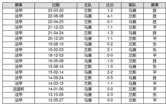 马赛 VS 兰斯两队近10年的交战次数为17场,马赛6胜7平4负,赢球概率为35.3%,平局概率为41.2%,输球概率为23.5%。