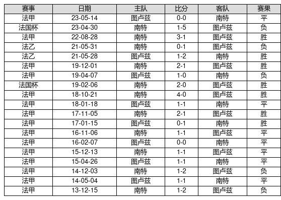 南特 VS 图卢兹两队近10年的交战次数为19场,南特7胜7平5负,赢球概率为36.8%,平局概率为36.8%,输球概率为26.3%。