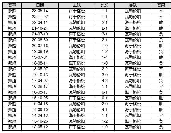 瓦勒伦加 VS 海于格松两队近10年的交战次数为21场,瓦勒伦加8胜5平8负,赢球概率为38.1%,平局概率为23.8%,输球概率为38.1%。