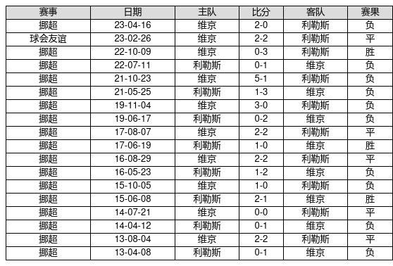 利勒斯 VS 维京两队近10年的交战次数为18场,利勒斯3胜5平10负,赢球概率为16.7%,平局概率为27.8%,输球概率为55.6%。