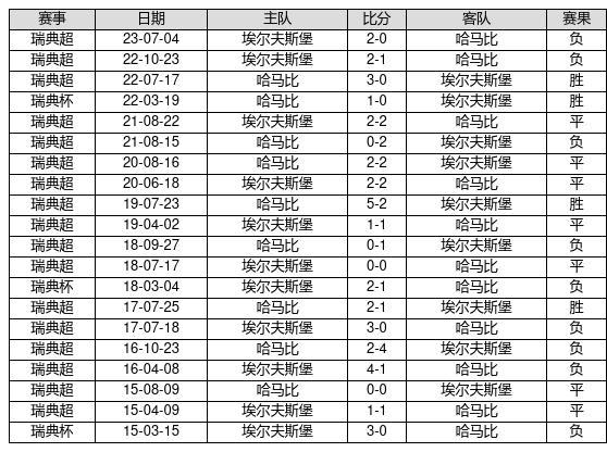 哈马比 VS 埃尔夫斯堡两队近10年的交战次数为20场,哈马比4胜7平9负,赢球概率为20%,平局概率为35%,输球概率为45%。