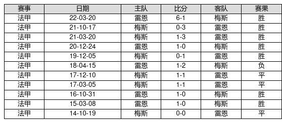 雷恩 VS 梅斯两队近10年的交战次数为11场,雷恩7胜3平1负,赢球概率为63.6%,平局概率为27.3%,输球概率为9.1%。