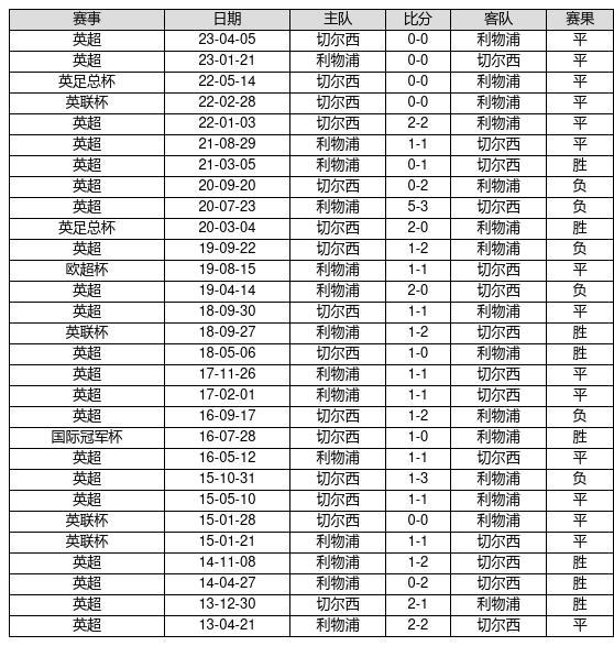 切尔西 VS 利物浦两队近10年的交战次数为29场,切尔西8胜15平6负,赢球概率为27.6%,平局概率为51.7%,输球概率为20.7%。