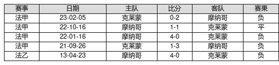 克莱蒙 VS 摩纳哥两队近10年的交战次数为5场,克莱蒙0胜1平4负,赢球概率为0%,平局概率为20%,输球概率为80%。