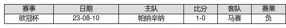 马赛 VS 帕纳辛纳两队近10年的交战次数为1场,马赛0胜0平1负,赢球概率为0%,平局概率为0%,输球概率为100%。