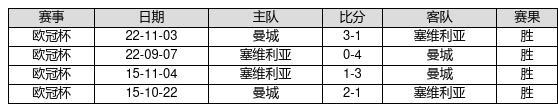 曼城 VS 塞维利亚两队近10年的交战次数为4场,曼城4胜0平0负,赢球概率为100%,平局概率为0%,输球概率为0%。