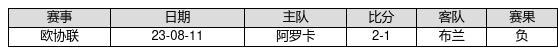 布兰 VS 阿罗卡两队近10年的交战次数为1场,布兰0胜0平1负,赢球概率为0%,平局概率为0%,输球概率为100%。