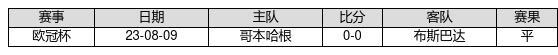 布斯巴达 VS 哥本哈根两队近10年的交战次数为1场,布斯巴达0胜1平0负,赢球概率为0%,平局概率为100%,输球概率为0%。