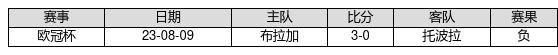 托波拉 VS 布拉加两队近10年的交战次数为1场,托波拉0胜0平1负,赢球概率为0%,平局概率为0%,输球概率为100%。