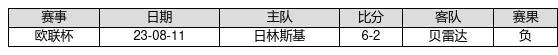 贝雷达 VS 日林斯基两队近10年的交战次数为1场,贝雷达0胜0平1负,赢球概率为0%,平局概率为0%,输球概率为100%。