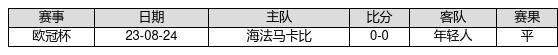年轻人 VS 海法马卡比两队近10年的交战次数为1场,年轻人0胜1平0负,赢球概率为0%,平局概率为100%,输球概率为0%。