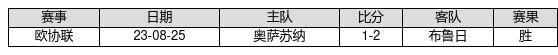 布鲁日 VS 奥萨苏纳两队近10年的交战次数为1场,布鲁日1胜0平0负,赢球概率为100%,平局概率为0%,输球概率为0%。