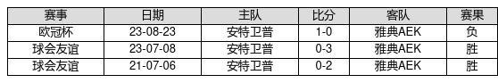 雅典AEK VS 安特卫普两队近10年的交战次数为3场,雅典AEK2胜0平1负,赢球概率为66.7%,平局概率为0%,输球概率为33.3%。