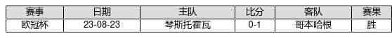 哥本哈根 VS 琴斯托霍瓦两队近10年的交战次数为1场,哥本哈根1胜0平0负,赢球概率为100%,平局概率为0%,输球概率为0%。