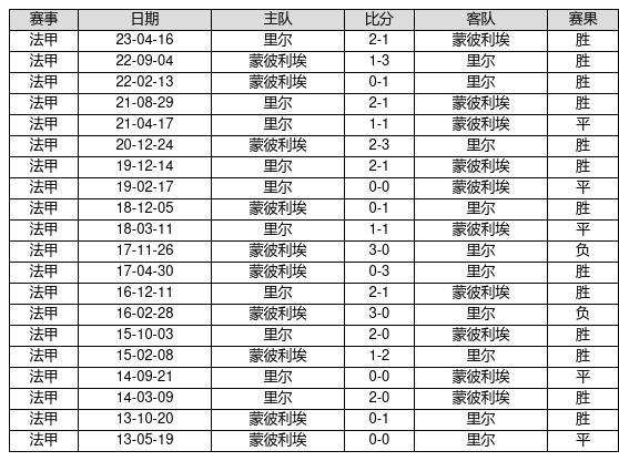 里尔 VS 蒙彼利埃两队近10年的交战次数为20场,里尔13胜5平2负,赢球概率为65%,平局概率为25%,输球概率为10%。