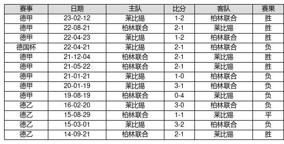 柏林联合 VS 莱比锡两队近10年的交战次数为13场,柏林联合6胜1平6负,赢球概率为46.2%,平局概率为7.7%,输球概率为46.2%。