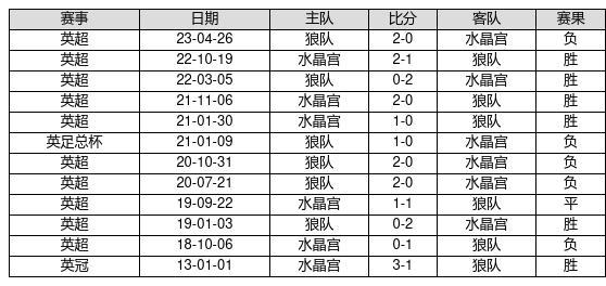 水晶宫 VS 狼队两队近10年的交战次数为12场,水晶宫6胜1平5负,赢球概率为50%,平局概率为8.3%,输球概率为41.7%。