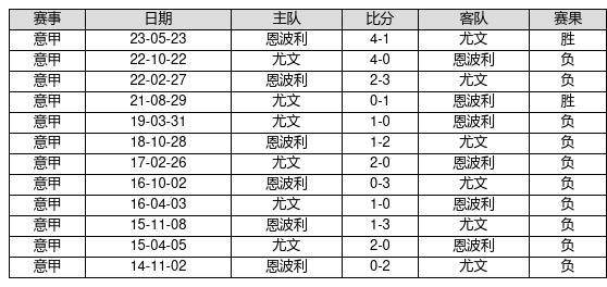 恩波利 VS 尤文两队近10年的交战次数为12场,恩波利2胜0平10负,赢球概率为16.7%,平局概率为0%,输球概率为83.3%。