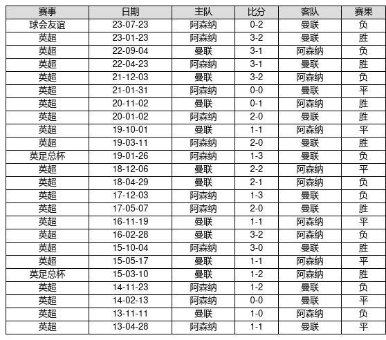 阿森纳 VS 曼联两队近10年的交战次数为24场,阿森纳8胜7平9负,赢球概率为33.3%,平局概率为29.2%,输球概率为37.5%。