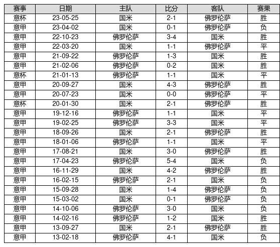 国米 VS 佛罗伦萨两队近10年的交战次数为24场,国米11胜6平7负,赢球概率为45.8%,平局概率为25%,输球概率为29.2%。