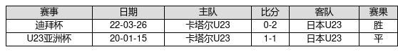 日本U23 VS 卡塔尔U23两队近10年的交战次数为2场,日本U231胜1平0负,赢球概率为50%,平局概率为50%,输球概率为0%。
