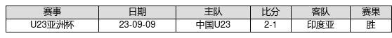中国U23 VS 印度亚两队近10年的交战次数为1场,中国U231胜0平0负,赢球概率为100%,平局概率为0%,输球概率为0%。