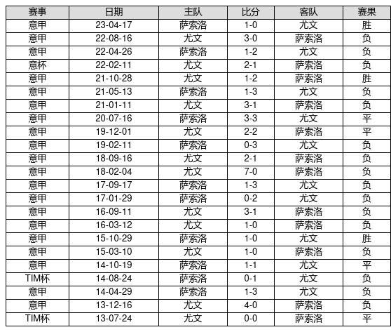 萨索洛 VS 尤文两队近10年的交战次数为23场,萨索洛3胜4平16负,赢球概率为13%,平局概率为17.4%,输球概率为69.6%。