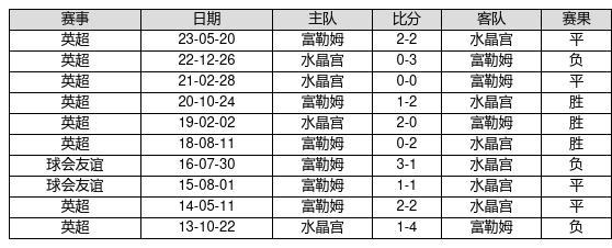 水晶宫 VS 富勒姆两队近10年的交战次数为10场,水晶宫3胜4平3负,赢球概率为30%,平局概率为40%,输球概率为30%。