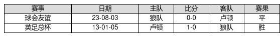 卢顿 VS 狼队两队近10年的交战次数为2场,卢顿1胜1平0负,赢球概率为50%,平局概率为50%,输球概率为0%。