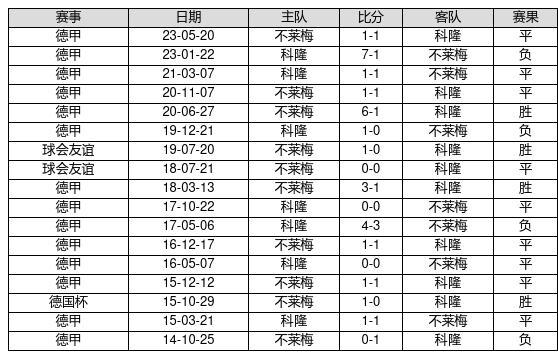 不莱梅 VS 科隆两队近10年的交战次数为17场,不莱梅4胜9平4负,赢球概率为23.5%,平局概率为52.9%,输球概率为23.5%。