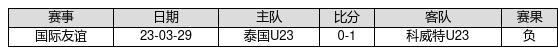 泰国U23 VS 科威特U23两队近10年的交战次数为1场,泰国U230胜0平1负,赢球概率为0%,平局概率为0%,输球概率为100%。