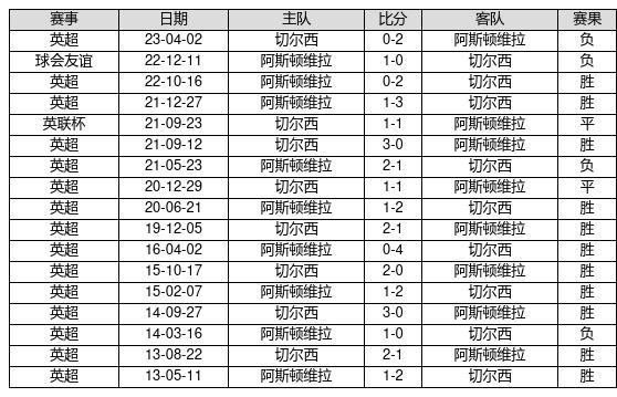 切尔西 VS 阿斯顿维拉两队近10年的交战次数为17场,切尔西11胜2平4负,赢球概率为64.7%,平局概率为11.8%,输球概率为23.5%。