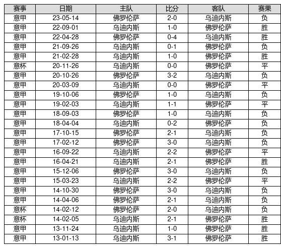 乌迪内斯 VS 佛罗伦萨两队近10年的交战次数为24场,乌迪内斯7胜5平12负,赢球概率为29.2%,平局概率为20.8%,输球概率为50%。