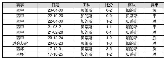 贝蒂斯 VS 加的斯两队近10年的交战次数为9场,贝蒂斯5胜2平2负,赢球概率为55.6%,平局概率为22.2%,输球概率为22.2%。