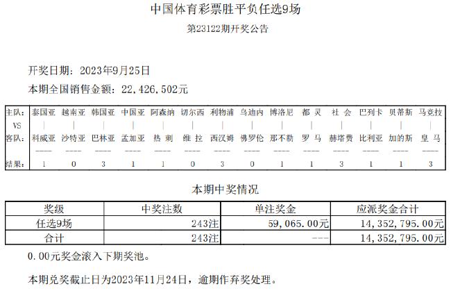 北京时间9月25日,胜负彩第23122期任九开奖结果揭晓。本期任九开243注,单注奖金59065元。本期任九投注总额为22,426,502元。