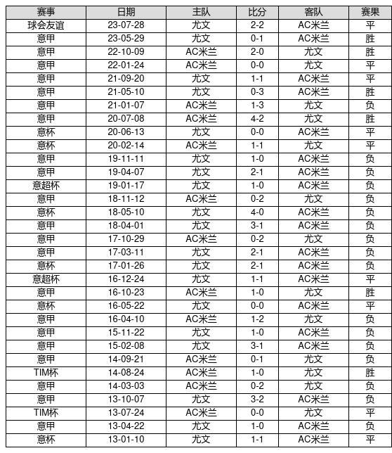 AC米兰 VS 尤文两队近10年的交战次数为32场,AC米兰6胜9平17负,赢球概率为18.8%,平局概率为28.1%,输球概率为53.1%。