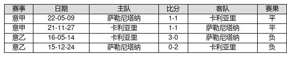 萨勒尼塔纳 VS 卡利亚里两队近10年的交战次数为4场,萨勒尼塔纳0胜2平2负,赢球概率为0%,平局概率为50%,输球概率为50%。