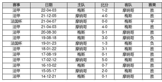 摩纳哥 VS 梅斯两队近10年的交战次数为13场,摩纳哥10胜1平2负,赢球概率为76.9%,平局概率为7.7%,输球概率为15.4%。