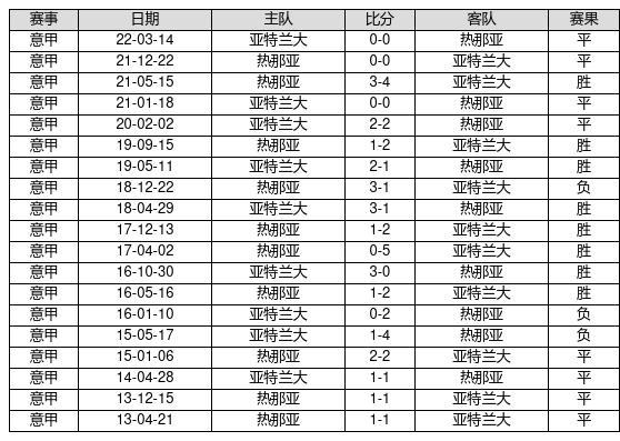 亚特兰大 VS 热那亚两队近10年的交战次数为19场,亚特兰大8胜8平3负,赢球概率为42.1%,平局概率为42.1%,输球概率为15.8%。