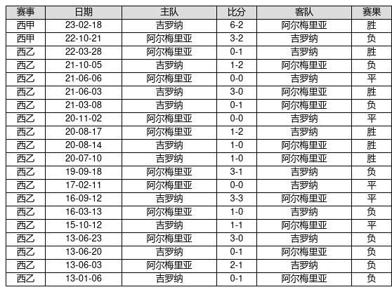 吉罗纳 VS 阿尔梅里亚两队近10年的交战次数为20场,吉罗纳6胜5平9负,赢球概率为30%,平局概率为25%,输球概率为45%。